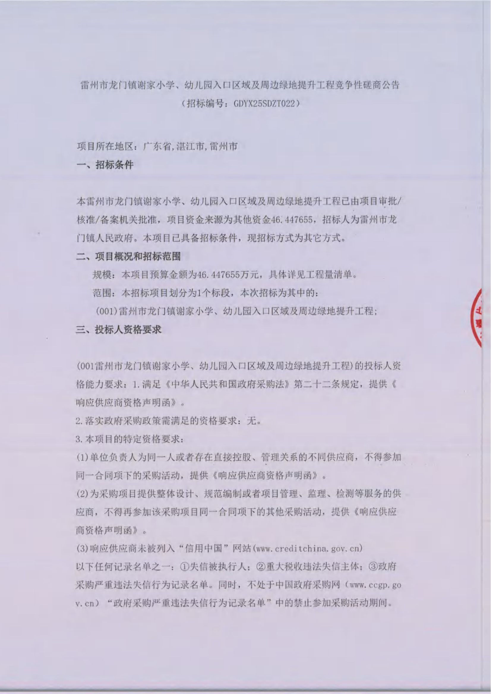 雷州市龙门镇谢家小学、幼儿园入口区域及周边绿地提升工程竞争性磋商公告